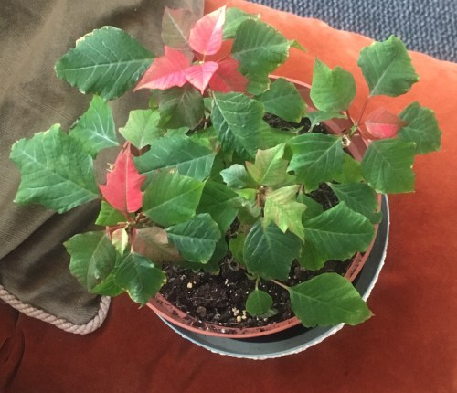 This month is not a colourful one in my garden at all! Therefore my ‘what’s flowering in my garden’ post is a difficult one. I’ve got some houseplants including this poinsettia that we somehow managed to keep alive by putting it in the dark somewhere over the summer and it has a few red leaves