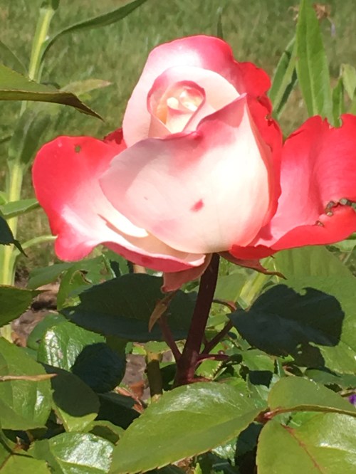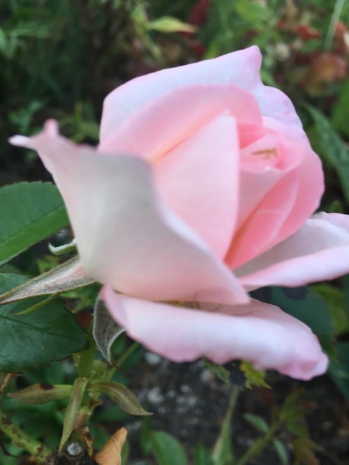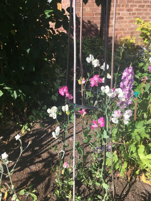 I do, however, have lots in flower at the moment. It’s a good year for roses and even the new one I planted last year that looked so unhappy last autumn has a flower (see below). The sweetpeas are scrambling up the wigwams and smelling lovely.