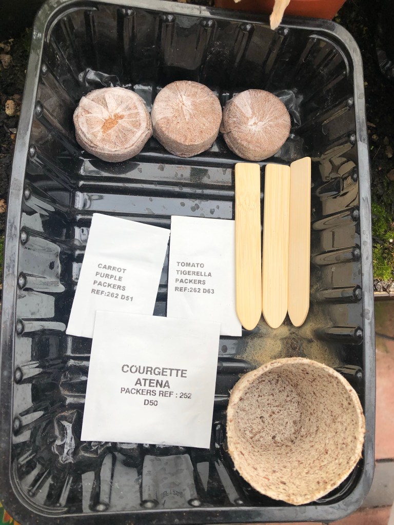 It included the following: seeds x5 although I’m only growing the ones I think we’ll eat, compost disks to be soaked in water before using, blank labels and coir pots